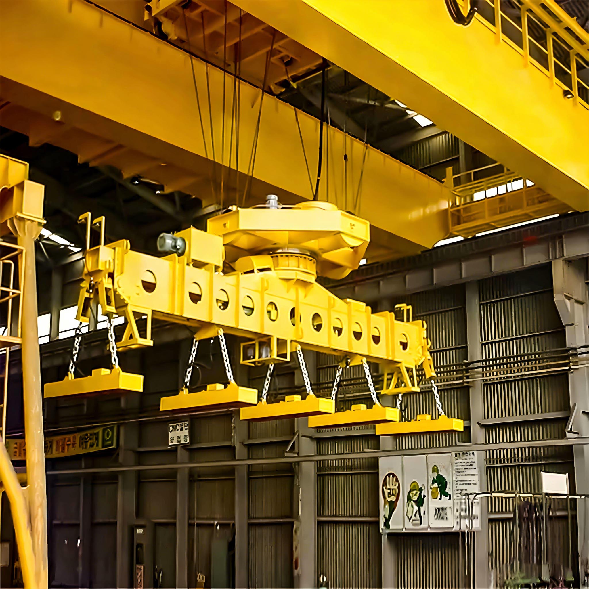 它的核心部件是電磁吸盤(也稱起重電磁鐵)。設(shè)備通電后,電磁吸盤產(chǎn)生強磁場,吸附住金屬物料;斷電后,磁性消失,物料即被釋放,實現(xiàn)了無需人工掛鉤的便捷操作。其設(shè)計符合重級工作制,通常工作級別為A6級,適合高強度、頻繁的作業(yè)環(huán)境。